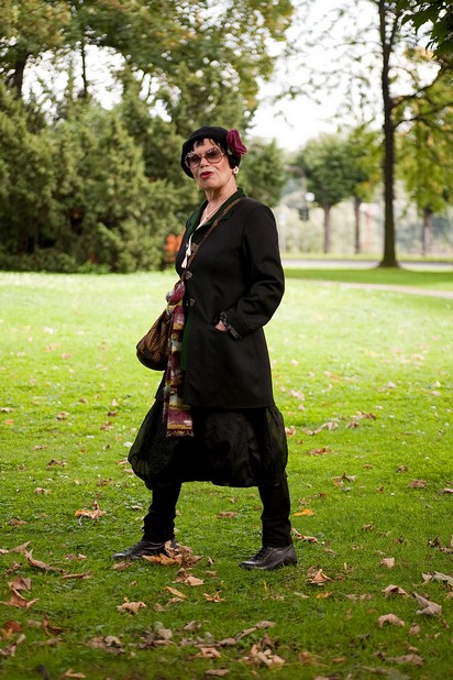 Da ich momentan die meiste Zeit in der gegenwärtigen Heimstatt einiger meiner Blogbewohner verbringe, ist es mal eine ganz angenehme Abwechslung einfach abzuwarten wer so vorbeikommt, um Fotos zu machen. Dieser Dame muss ich dennoch hinterher rennen, denn gemeinsam mit ihrem Mann eilt sie zielstrebig der Seilbahn entgegen. Bestens gelaunt freut sie sich, dass ich sie fotografieren möchte und ruft ihren Mann herbei, der schon fast an der Kasse steht. Während wir draussen Fotos machen guckt er sich drinnen welche an, und liest sich sogar richtig fest. So haben wir ein wenig Zeit zum reden; Frau B. malt: „und zwar meistens Menschen und Gesichter.“ Die faszinieren sie einfach, sagt sie, und ich bin gleichfalls von ihr selbst fasziniert. Sie tänzelt umher, redet und lacht sehr viel, und mit ihrem Mann pflegt sie einen gutgelaunten Umgang, gespickt mit munteren Sticheleien. Ich bin derart angetan von ihr, dass wir uns verabreden, damit ich auch ihre Bilder sehen kann. Zunächst sieht sie sich erst mal meine an, und als die beiden schließ- lich aufbrechen haben sie den Plan Seilbahn zu fahren inzwischen verworfen: „Nee, das hat sich jetzt hier schön ergeben, und nun ist es richtiger so…“ Wichtig ist für Frau B. übrigens das Lachen im Leben, und das hätte ich eigentlich auch gut raten können.
