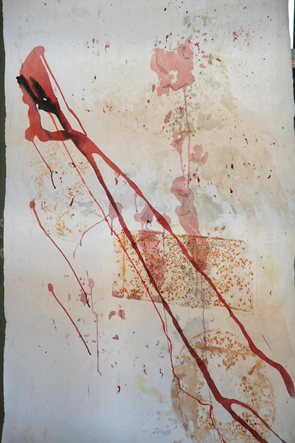 Auch in ihren Bildern ist das Element Rost zu finden; auf Ingrespapier verbindet sie Wachs und Kreide mit Rostapplikationen, wie beispielsweise in dieser Arbeit.