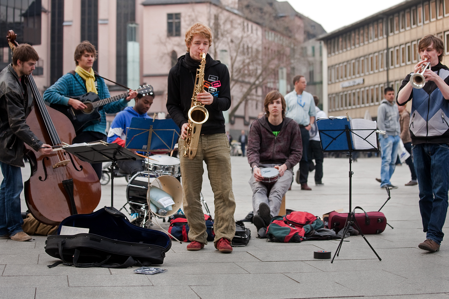 Fabian spielt Saxophon und er verrät mir, dass sie aus Freiburg kommen: „Wir hatten alle letzte Woche schriftliches Abi, und jetzt sind wir ein bisschen herumgefahren, um unsere CD zu verkaufen.“ Alle wollen „etwas mit Musik“ machen, jetzt wo die Schule vorbei ist. Fabian hat sich unter anderem auch in Köln an der Musikhochschule beworben.